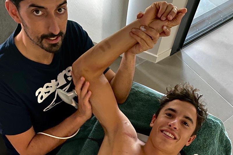 Latihan fisik pun dilakoni Marquez untuk mengembalikan kekuatan lengannya.
