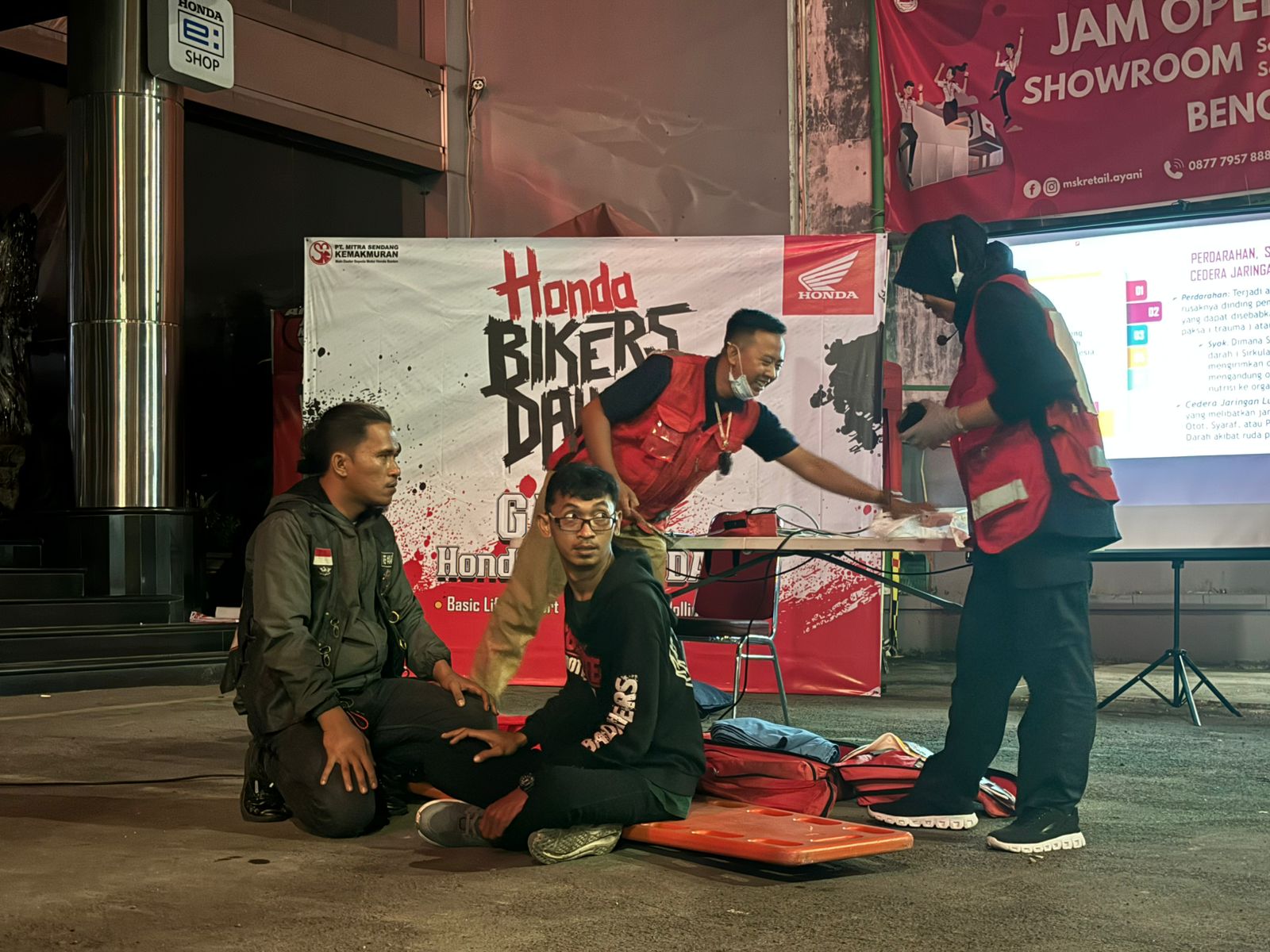 Para peserta mengikuti pelatihan Basic Life Support (BLS) dan First Aid yang diberikan oleh PMI Kota Serang. Dalam sesi tersebut, bikers dibekali keterampilan dasar pertolongan pertama yang penting dimiliki setiap pengendara motor.