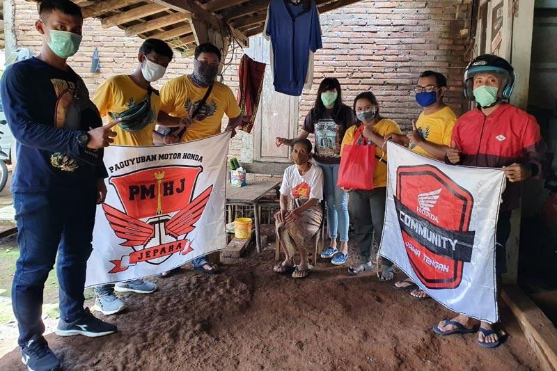 Paguyuban Motor Honda Jepara membagikan sembako kepada sejumlah warga yang membutuhkan di desa Bawu, Ngabul dan Pekalongan, Jepara, Jawa Tengah (19/4).