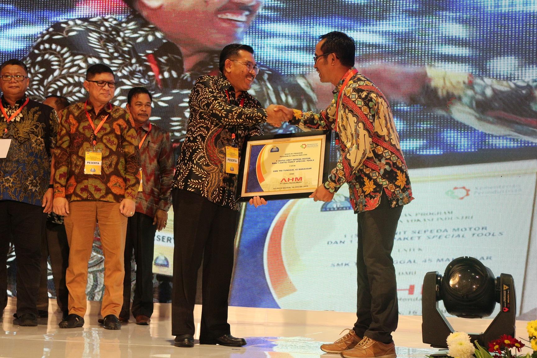 Sebagai bentuk komitmen dalam upaya pengembangan pendidikan vokasi, AHM bersama 15 SMK binaan menandatangani kesepakatan kerjasama dalam rangkaian acara Peluncuran Program Pendidikan Vokasi Industri di wilayah Sulawesi bagian Selatan yang berlokasi di Kawasan Industri Makassar, Sulawesi Selatan (16/1). Dalam kesempatan ini AHM menyerahkan bantuan sarana praktik berupa 16 Unit Sepeda Motor Honda dan 15 Special Tools serta Materi Ajar kepada 15 SMK mitra binaan AHM di wilayah Sulawesi bagian Selatan ini.